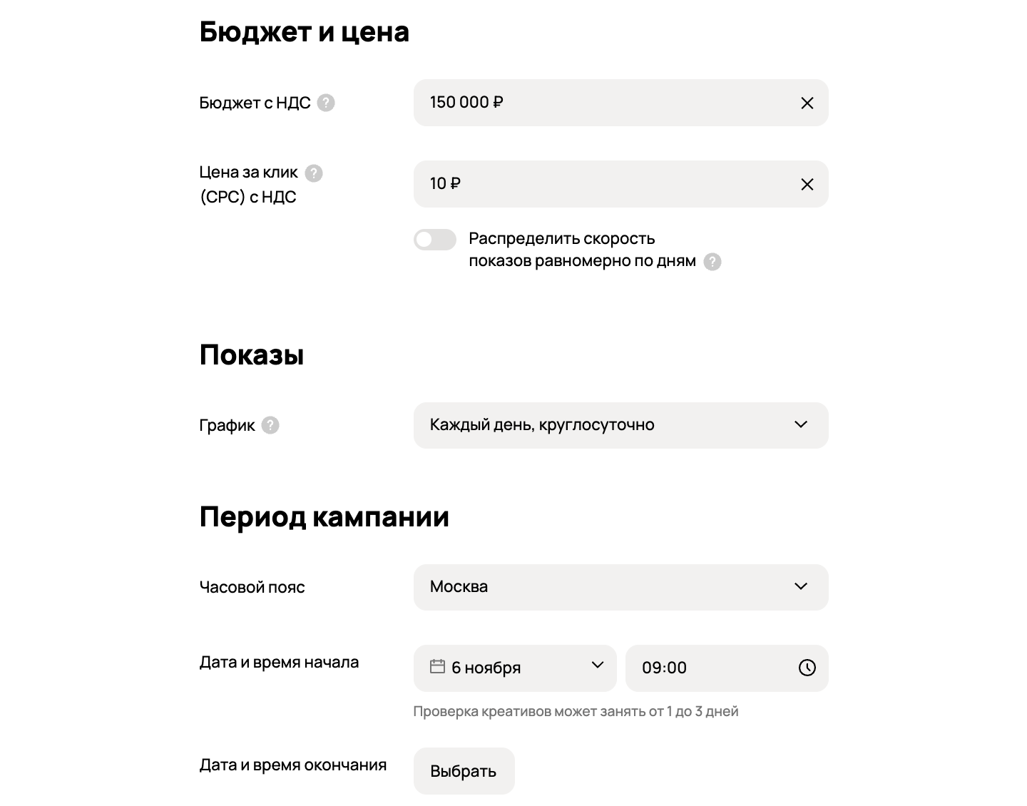 Бюджет: Можно распределять равномерно (удобно, чтобы не слить все за час в погоне за первым лидом) или выставить «максимум показов/кликов» для самых нетерпеливых.
